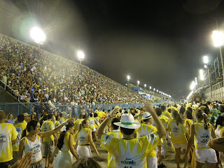 Samedi soir dernier fut de nouveau un moment particulier : Nathalie et moi, ainsi que notre joyeuse troupe d'amis franco-brésiliens (bon franco, c'est vrai en grosse majorité, je dois le concéder... ;), avons arpenté avec un bonheur non dissimulé la mythique avenue Marquês de Sapucai, plus communément dénommée le Sambodromo do Rio ! Nous avons enfilé pour l'occasion notre camiseta amarelha seyante et sexy (à admirer sur les photos ci-dessous) de notre ala Comunicação, et brillamment défilé au son de "Brasil de todos os deuses", l'enredo 2010 (la chanson, superbe au demeurant) concocté par notre divine école, Imperatriz (vous pouvez le découvrir ici) ! Il s'agissait pour l'occasion de notre deuxième et dernier ensaio tecnico (en gros, la répétition du show) avant le défilé en grandeur nature, dimanche 14 février prochain à 22 heures, en compagnie de nos écoles rivales et néanmoins amies.